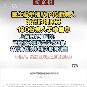 近日,一网友实名举报称,上海市东方医院创伤外科主任、主任医师孙某新私下传播病人麻醉时裸照及180份病人手术信息,引发关注。据新京报7月4日报道,目前,院方已暂停孙某新医生医疗工作,并配合相关部门调查。