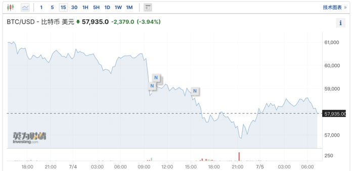 过去24小时内,虚拟币市场经历了大幅波动。英为财情行情数据显示,比特币从超6万美元持续下跌,一度跌破57000美元关口,最低至56750美元。其他虚拟货币亦是类似走势。