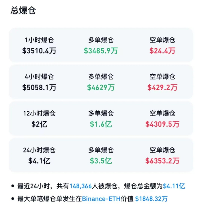 CoinGlass数据显示,最近24小时,虚拟币市场共有近15万人被爆仓,爆仓总金额约4.11亿美元。最大单笔爆仓发生在以太坊。