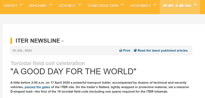 7月1日,国际热核聚变实验反应堆项目(ITER,又称“人造太阳”计划)迎来重要里程碑。经过二十年的设计、生产、制造和组装,这个跨国合作项目的大型环形场线圈在日本和欧洲成功完工并交付。据ITER官方发布的消息,19个巨型线圈都已运抵法国南部,为这个巨型核聚变项目的首次等离子体实验铺平了道路。这也标志着该反应堆设计过程的结束,距离投入使用仅一步之遥。