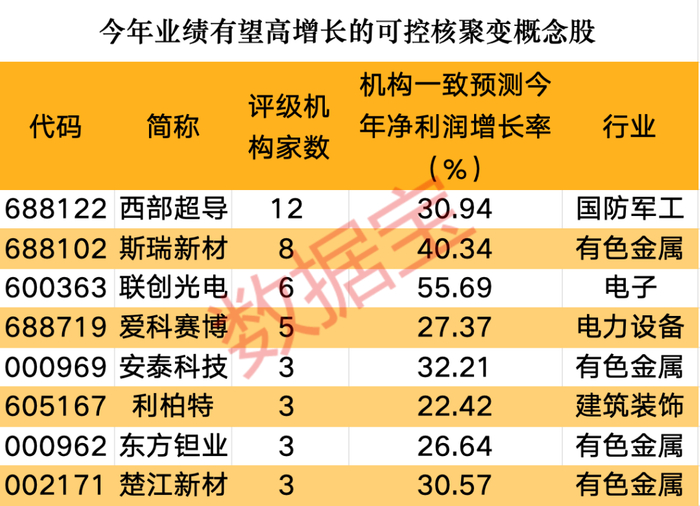据证券时报·数据宝统计,可控核聚变概念股中,西部超导、斯瑞新材、联创光电、爱科赛博等8股获3家以上机构评级且一致预测今年净利润增速超20%。