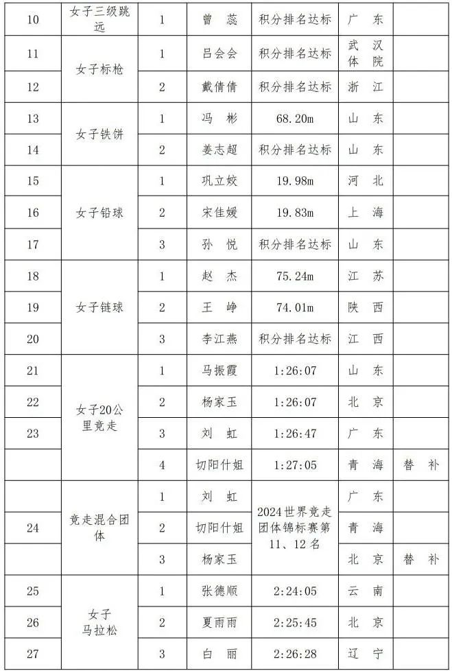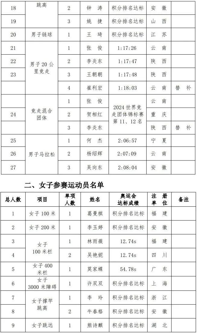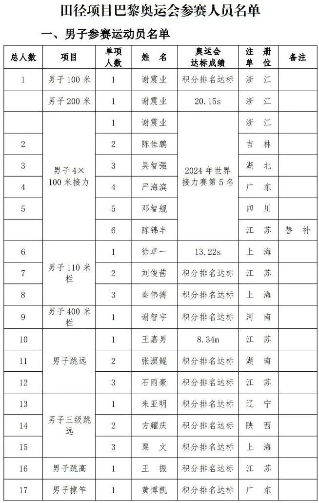 7月4日,中国田径协会公示巴黎奥运会参赛人员名单,中国田径队将派出54名运动员(男、女各27名运动员)参加巴黎奥运会田径全部48个小项中27个小项的比赛。其中,东京奥运会女子铅球冠军巩立姣将第五次踏上奥运赛场,谢震业将身兼男子100米、男子200米和男子4×100米接力三项。