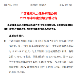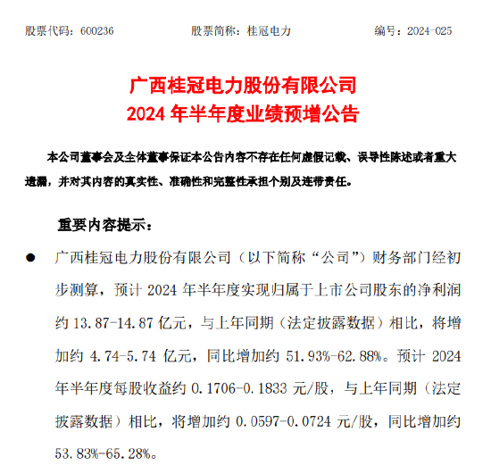 7月4日晚,桂冠电力发布2024年上半年业绩预增公告,净利润同比增长超50%。此外该公司、长江电力及华能水电披露的上半年发电量均同比涨超10%。