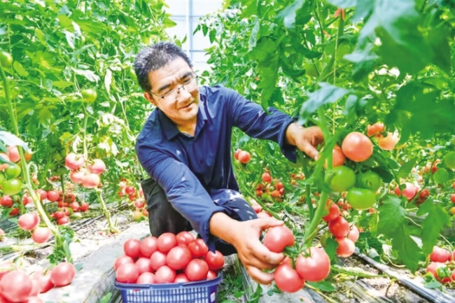 近日,在敦煌市转渠口镇盐茶村创意农业园区,种植户杨建福新引种的普罗旺斯西红柿喜获丰收,吸引很多市民游客前来采摘。