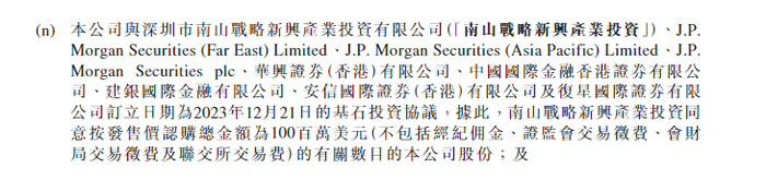 南山战略新兴产业投资于2023年12月21日与速腾聚创达成基石投资协议。根据协议,南山战略新兴产业投资同意按照发行价认购总额为1亿美元的股票。