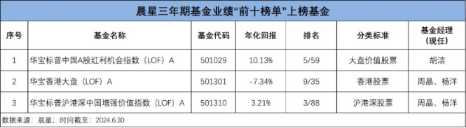 数据来源:晨星,数据截至2024.6.30。华宝标普中国A股红利机会指数(LOF)A(501029)最近3年年化回报达10.13%,在59只“大盘价值股票”同类基金中排名第5;最近5年年化回报达10.26%,在39只“大盘价值股票”同类基金中排名8。华宝香港大盘(LOF)A(501301)最近3年年化回报达-7.34%,在35只“香港股票”同类基金中排名第9。华宝标普沪港深中国增强价值指数(LOF)A(501310)最近3年年化回报达3.21%,在88只“沪港深股票”同类基金中排名第3。华宝资源优选混合A(240022)最近5年年化回报达20.24%,在129只“积极配置-大盘平衡”同类基金中排名第8。华宝宝康配置混合(240002)最近5年年化回报达11.37%,在45只“标准混合”同类基金中排名第8。华宝可转债债券A(240018)最近5年年化回报达8.17%,在33只“可转债”同类基金中排名第3。华宝医药生物优选混合A(240020)最近5年年化回报达7.88%,在39只“行业混合-医药”同类基金中排名第9。银行ETF(512800)最近5年年化回报达3.13%,在34只“行业股票-金融地产”同类基金中排名第5。