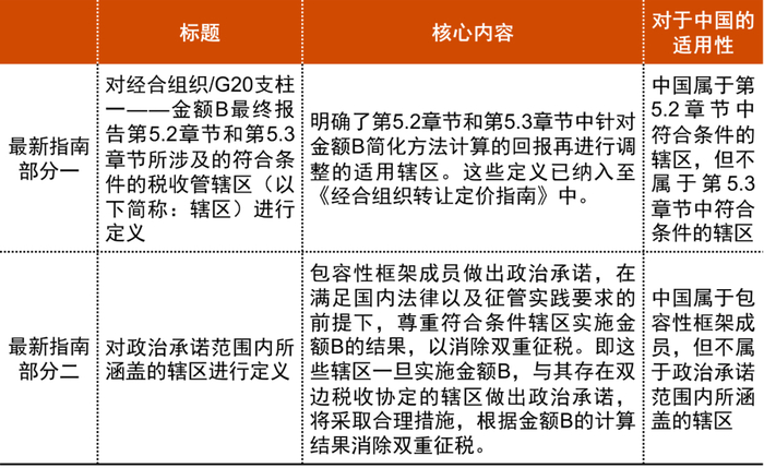 尽管在最新指南部分一中,中国属于第5.2章节中符合条件的辖区,但由于第5.2章节指的是对适用金额B简化方法计算的回报再进行营业费用交叉检查,因此,如果中国不实施金额B,则实质上不会受到第5.2章节的影响;