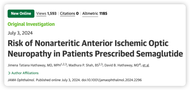 7月3日,来自哈佛医学院附属马萨诸塞州眼耳医院的团队在《美国医学会眼科学杂志》(JAMA Ophthalmology) 上发表了一篇论文,题为“服用司美格鲁肽的患者发生非动脉炎性前部缺血性视神经病变的风险”,引发了医学界和投资界的广泛关注。