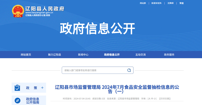 【辽宁省辽阳市】辽阳县市场监督管理局2024年7月食品安全监督抽检信息的公告