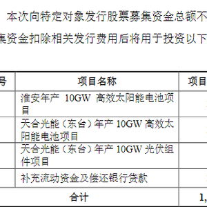 天合光能曾在2023年7月披露定增预案。根据当时的公告,天合光能拟募集109亿元,除用于补充流动资金及偿还银行贷款外,还投资建设三个项目,包括“淮安年产10GW高效太阳能电池项目” “天合光能(东台)年产10GW高效太阳能电池项目”和“天合光能(东台)年产10GW光伏组件项目”,建设完成后将合计新增20GW高效太阳能电池产能和10GW高效组件产能。