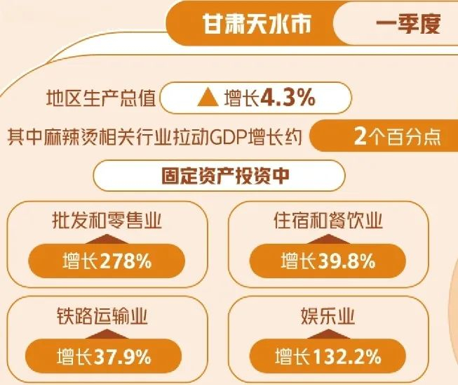 据统计,今年一季度,天水市地区生产总值同比增长4.3%,其中麻辣烫相关行业拉动GDP增长约2个百分点;固定资产投资中,批发和零售业、住宿和餐饮业、铁路运输业、娱乐业分别增长278%、39.8%、37.9%和132.2%。此外,城市美誉度的提升也释放出更多口碑红利。一季度,天水市新签约招商引资项目37项,新建续建项目省外到位资金121.38亿元,同比增长68.79%。
