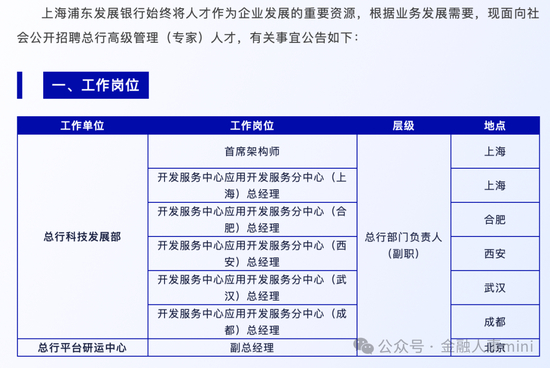 具体来看,此次浦发银行总行科技发展部拟招聘首席架构师,以及上海、合肥、西安、武汉和成都五地的开发服务中心应用开发服务分中心总经理。同时,浦发银行总行平台研运中心拟招聘副总经理一名。且上述职务层级均为总行部门负责人(副职)。