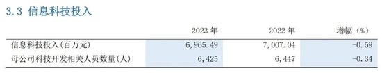 信息科技一直是浦发银行发展的战略重点。年报显示,2023年,浦发银行信息科技投入总额为69.65亿元,约占营业收入的4%;科技开发相关人员数量为6,425人,约占全行员工总数的10.6%。