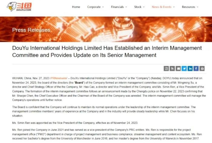 陈少杰被捕三日后,斗鱼成立了一个临时管理委员会。委员会由公司董事兼首席战略官苏明明、公司董事兼副总裁曹昊和公司副总裁任思敏组成。