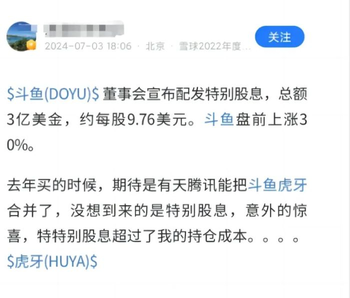 “特别股息超过了我的持仓成本”,一位自称在2023年年底买入斗鱼的雪球用户称。
