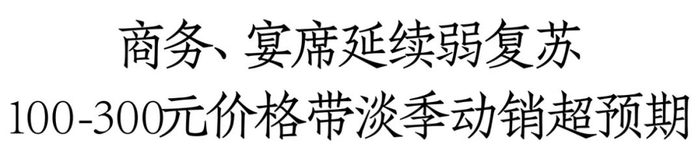 他进一步分析,其一是因为市场整体消费降级,比如原来的500-800元价格带向300-500元降级,今天畅销的100-300元也是之前的200-300元价格带的下移;其二,商务场景及宴席消费的减少也是重要原因,主流的普通聚饮消费还是以100-300元为主。