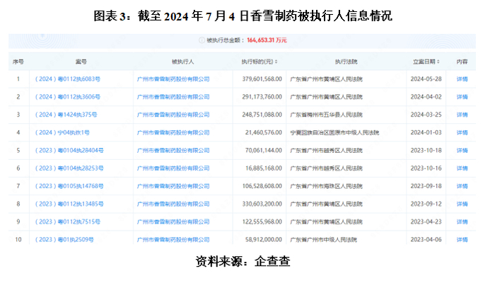 值得注意的是,如图表3所示,2023年4月至今,香雪制药还存在10笔被执行人信息,被执行总金额达16.47亿元,所属案件多为合同纠纷,涉及社会(S)维度中的客户、供应商等利益相关方。