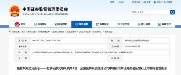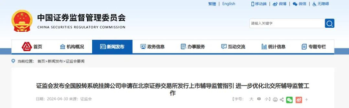 2024年4月30日证监会发布全国股转系统挂牌公司申请在北京证券交易所发行上市辅导监管指引 进一步优化北交所辅导监管工作