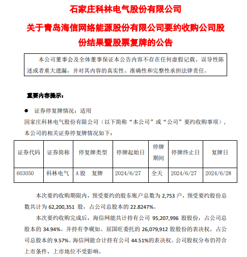 这两家企业没有让大家等待太久,时隔47天,6月28日,科林电气(603050.SH)发布公告称,在本次要约收购期限内,预受要约的股东账户总数为2753户,预受要约股份总数共计6220万股,占公司目前股份总数的22.82%,算是一锤定音!