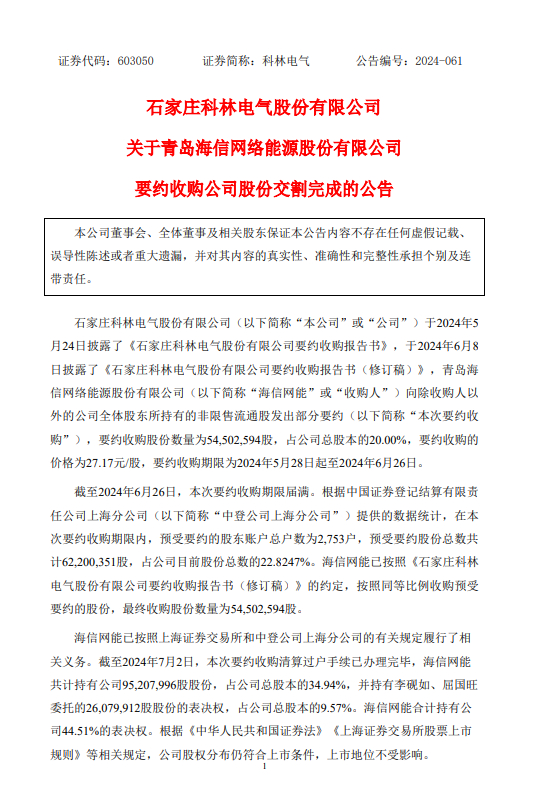 而后,科林电气于2024年5 月24日披露了《石家庄科林电气股份有限公司要约收购报告书》,于2024年6月8 日披露了《石家庄科林电气股份有限公司要约收购报告书(修订稿)》,海信网能向除收购人以外的公司全体股东所持有的非限售流通股发出部分要约,要约收购股份数量为54,502,594股,占公司总股本的20.00%,要约收购的价格为27.17元/股,要约收购期限为2024年5月28日起至2024年6月26日。