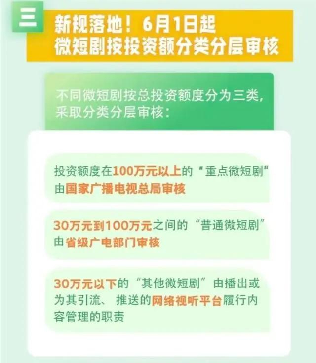今年6月1日,网络微短剧管理新规定正式实施生效,新规要求落实行业监管责任、属地管理责任、平台主体责任,对微短剧实行“分类分层审核”,未经审核且备案的微短剧不得上网传播。