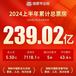 据猫眼专业版数据显示,上半年电影大盘为238.97亿。这一数字不仅比受疫情影响的2021年和2023年要低出20亿以上,还比2016年都稍逊一筹。
