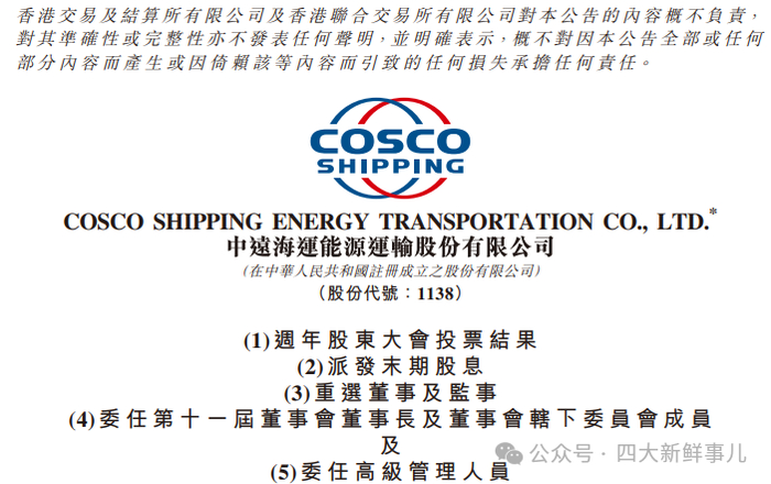 中远海能续聘普华永道为境外核数师