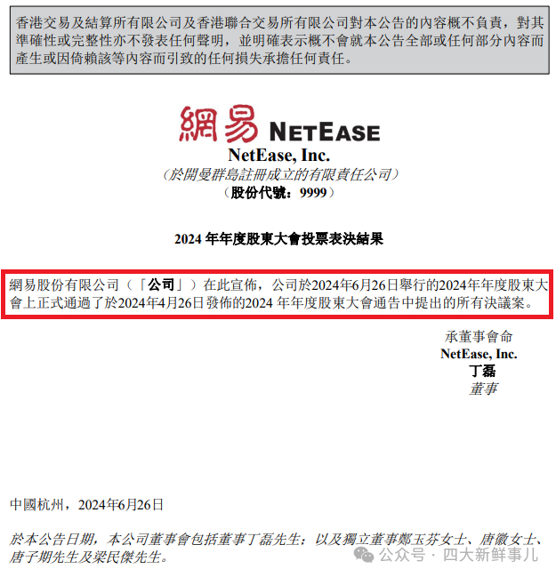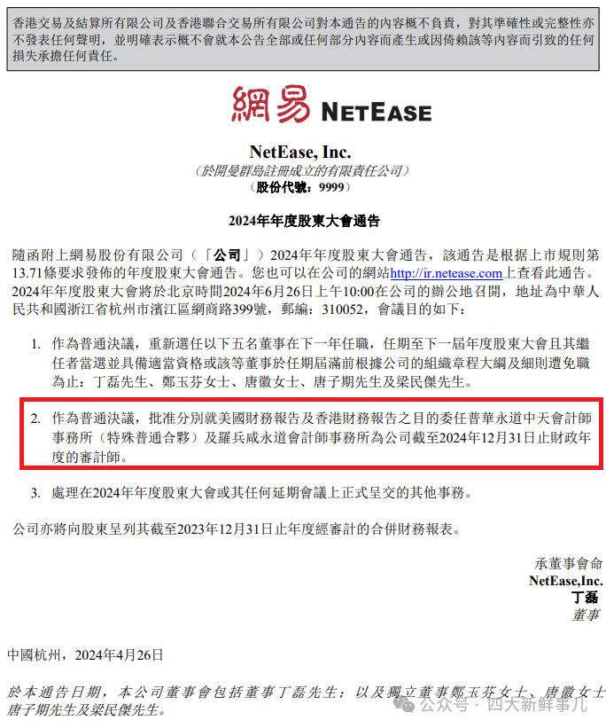 港股上市公司网易-S(09999.HK)于2024年4月26日发布的公告显示,作为普通决议,批准分别就美国财务报告及香港财务报告之目的委任普华永道中天会计师事务所(特殊普通合伙)及罗兵咸永道会计师事务所为公司截至2024年12月31日止财政年度的审计师。