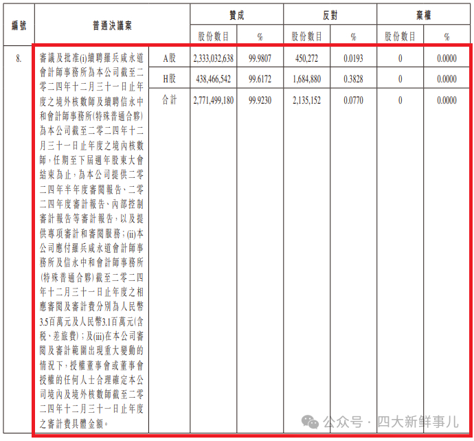 港股上市公司中远海能(01138.HK)于2024年6月28日发布的公告显示,审议及批准(i)续聘罗兵咸永道会计师事务所为本公司截至二零二四年十二月三十一日止年度之境外核数师及续聘信永中和会计师事务所(特殊普通合伙)为本公司截至二零二四年十二月三十一日止年度之境内核数师,任期至下届周年股东大会结束为止,为本公司提供二零二四年半年度审阅报告、二零二四年度审计报告、内部控制审计报告等审计报告,以及提供专项审计和审阅服务;(ii)本公司应付罗兵咸永道会计师事务所及信永中和会计师事务所(特殊普通合伙)截至二零二四年十二月三十一日止年度之相应审阅及审计费分别为人民币3.5百万元及人民币3.1百万元(含税、差旅费);及(iii)在本公司审阅及审计范围出现重大变动的情况下,授权董事会或董事会授权的任何人士合理确定本公司境内及境外核数师截至二零二四年十二月三十一日止年度之审计费具体金额。总计99.92%股东投同意票。