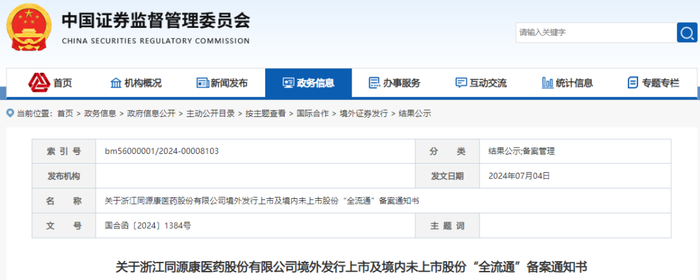 2024年7月4日,中国证监会国际合作司发布关于浙江同源康医药股份有限公司境外发行上市及境内未上市股份“全流通”备案通知书(国合函〔2024〕1384号)。