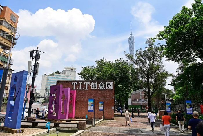这里是T.I.T创意园,其前身是1956年成立的广州纺织机械厂。20世纪90年代,原来的纺织机械厂产值不断下滑,于是这片旧厂房开始了改造,经过“修旧如旧、建新如故”,如今变身为互联网与创意设计等人才的汇集地。目前,园区内有近100家企业入驻。