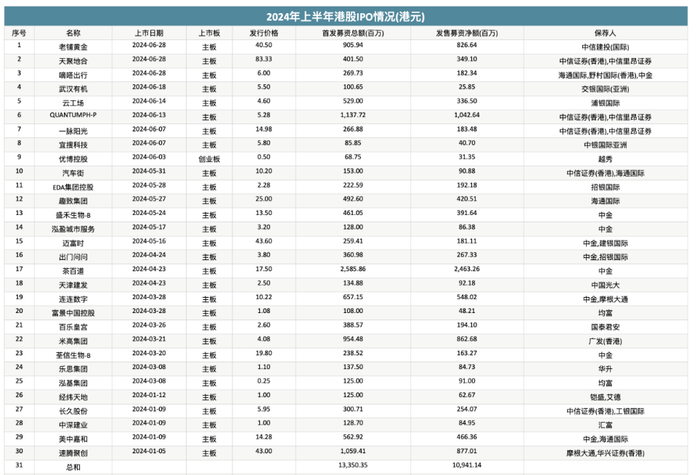据wind数据,在2024年上半年的新股保荐业务中,几乎已罕见外资机构的身影。上半年港股市场共有30只新股上市,募资额133.5亿港元,募资净额109.4亿港元。其中,中金参与了9宗IPO的独家或联席保荐,保荐数量断层第一;其余机构中,中信证券(香港)参与5宗、海通国际参与4宗、招银国际、均富参与2宗,建银国际、国泰君安、华兴证券、工银国际、中国光大等参与1宗。