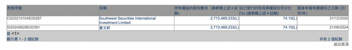 2024年6月21日,自然人黄文轩成为西证国际证券个人大股东,增持均价均价0.0331港元,涉及总金额约8981.58万港元。增持后,黄文轩对西证国际证券的持股比例从0上升至74.01%。根据西南证券的公告,买家黄文轩,是一名现年36岁的香港企业家,主要涉足建筑和投资领域,现为智海投资有限公司董事,达艺室内设计工程(中国)有限公司董事、行政总裁兼董事总经理。