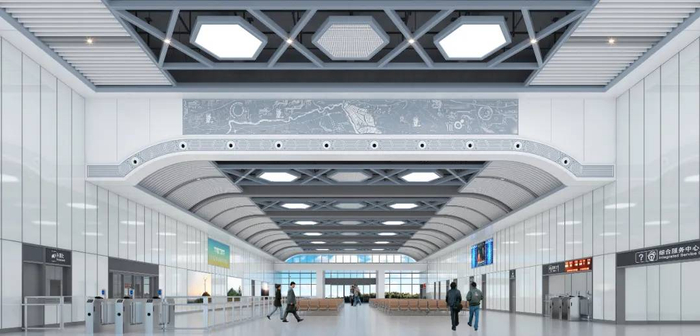 根据工业性、交通性的城市特征,站房整体空间以浅灰色为主色调,蓝灰、黄灰色为点缀色,色彩均进行低饱和度处理,让整个空间色彩更加和谐统一。候车大厅围绕“六”字进行发散联想、抽象提取,以六边形为轮廓,形成基本几何造型元素,运用在候车厅吊顶及墙面装饰中。