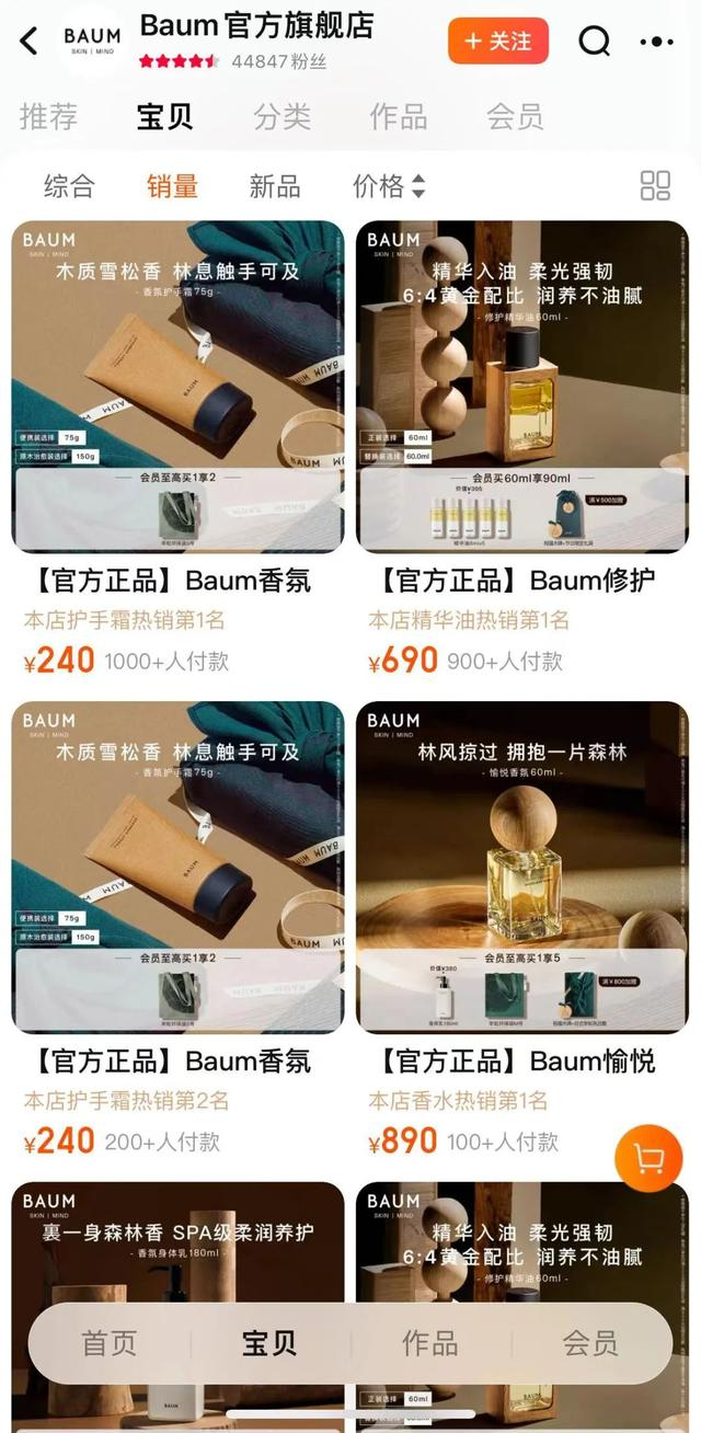 记者在其天猫旗舰店上看到,该店铺共有4.4万粉丝,产品包含精油、化妆水、面霜、乳液、面膜、洁面乳、护手霜、身体乳等。销量最高的产品为一款护手霜,店铺页面数据显示销量超过1000,其次为一款精油,销量超过900。