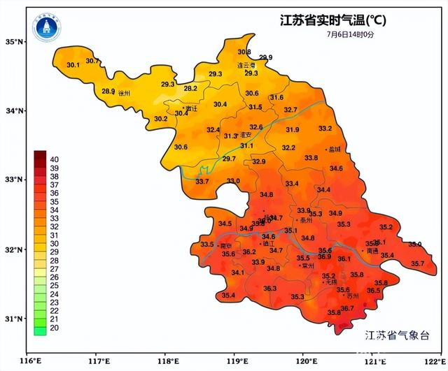 “小暑”节气也意味着盛夏时光即将开启。江苏省气象台也继续发布高温橙色预警信号,大家要注意防暑降温。刘梅说:“高温仍然维持在淮河以南地区,区域来看在南通、苏州、无锡、常州这一带,还有南京的南部这一带的最高气温可能达到37度。江淮之间像盐城、泰州、扬州以及南京的东北部、还有镇江这些区域,基本上是能够达到35度到36度。”