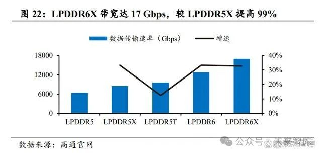 内存带宽限制 AI 手机性能,LPDDR6 预计将加速渗透。根据联发科, 运行 130 亿参数端侧大模型所需内存带宽为 130 GB/s,目前已发布的 AI 手机搭载的最优 DRAM 为 LPDDR5×,数据传输速度为 8.5 Gbps,理 论峰值带宽为 68.3 GB/s,远未达到百亿参数大模型数据传输需求,限制 端侧大模型数据处理能力。JEDEC 固态技术协会预计在 2024Q3 发布 LPDDR 6 内存标准定稿,LPDDR 6/LPDDR6X 数据传输速度分别将达到 12.8/17 Gbps,理论峰值带宽达到 102.4/136 GB/s,可完全释放百亿参数 端侧大模型性能,预计将加速搭载至 AI 手机中。GSMArena 预计骁龙 8 Gen4 旗舰会率先搭载 LPDDR6。