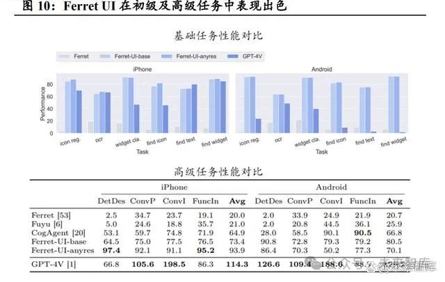 iPhone 环境下 Ferret UI 性能接近或超过 GPT-4V。Ferret UI 模型可完 成简单的 UI 定位和查询任务,在 iPhone 环境下 130 亿参数的 Ferret UI 模型在初级 UI 任务中超越 GPT-4V。并且可根据 UI 与用户进行感知对 话、交互对话,告诉用户相应位置具体的 UI 内容,如何与 UI 进行交互, 根据 UI 元素推断软件功能,在高级任务中的表现与 GPT-4V 接近。若 将 Ferret UI 与 AI 助理进行结合,AI 助理可深入理解用户意图,并基于 用户自然语言指令与手机 APP 进行交互,实现 AI 系统级应用。