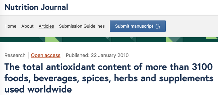 [2]Carlsen MH, Halvorsen BL, Holte K, Bøhn SK, Dragland S, Sampson L, Willey C, Senoo H, Umezono Y, Sanada C, Barikmo I, Berhe N, Willett WC, Phillips KM, Jacobs DR Jr, Blomhoff R. The total antioxidant content of more than 3100 foods, beverages, spices, herbs and supplements used worldwide. Nutr J. 2010 Jan 22;9:3. doi: 10.1186/1475-2891-9-3. PMID: 20096093; PMCID: PMC2841576.
