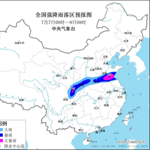 图1 全国强降水落区预报(7月7日08时-8日08时)