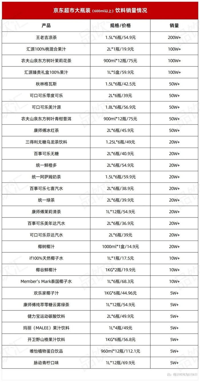 电商平台的销售数据也证明了这一点。据品饮汇整理发现,在京东超市上架的29款销量超过5W+的大瓶装饮料中,1L左右的大瓶装产品中的无糖茶、椰子水、电解质水成为主流。