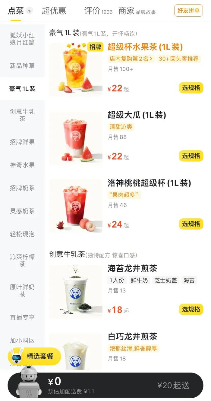 随着大瓶饮料的兴起,1L的规格也蔓延到杯装茶饮市场。