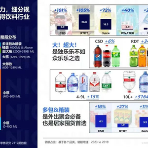 根据尼尔森IQ对全国饮料行业规格段划分,大即饮及大瓶饮料的包装规格为600ml~1249ml和1249ml~1999ml,刚好契合人们的每日饮水量需求。