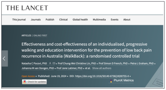 2024年6月,来自澳大利亚的团队在国际著名医学期刊《柳叶刀》上发表了一项研究,研究结果表明,步行不仅是一种低成本、低风险的运动,还能显著减少下背痛的复发,特别是对于背痛初发者。