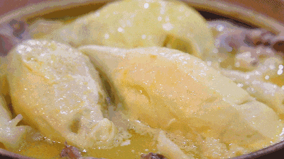 说来神奇,榴莲本身性热,吃多了容易上火,但与果肉紧密为邻的榴莲瓢却能清热去火气,所以偶尔贪嘴多吃了几块榴莲,也无需担心,用榴莲瓢煲榴莲鸡汤喝即可下火。榴莲的白瓢带着少许榴莲味,没有甜味,如若生吃,口感根据榴莲品种各异,有些偏粉糯,有些偏干硬,介乎于板栗和莲藕之间。熬汤之后,浸泡在汤水中的榴莲瓢变得更加绵软,榴莲味没了踪影,汤水清香甜润,喝汤时舀起一块榴莲瓢,伴着汤汁一同吃进嘴里,竟全然忘了这是榴莲的一部分。榴莲那股“飞扬跋扈”、顷刻之间攻陷人的鼻腔的浓烈熏香,在文火细熬之下,化成一汪柔情似水,即使是不爱吃榴莲的人,也能毫无心理负担地喝下一碗榴莲鸡汤。