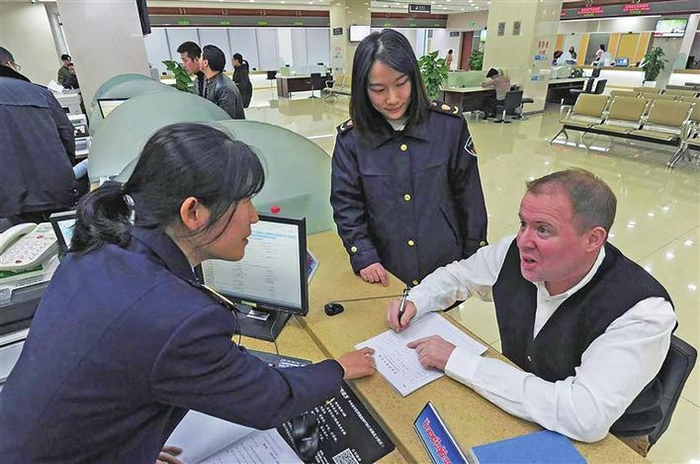 在浙江省义乌市国际贸易服务中心办事大厅,工作人员在为英国商人泰山(右)提供外贸咨询服务。近年来,义乌推出一系列“当天申请、当天办结”的办事措施,以高效便利的服务优化涉外营商环境。新华社记者 谭 进 摄