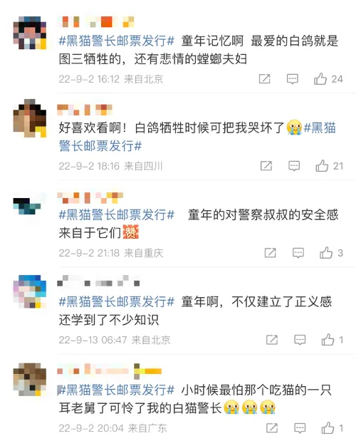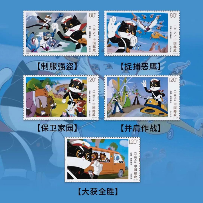 《动画—黑猫警长》纪念邮票则在2022年发行,全套邮票一共五枚。