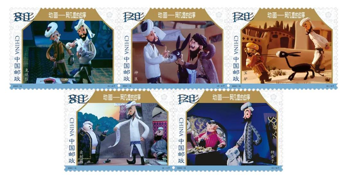 全套邮票一共5枚,分别还原了《卖树荫》《兔送信》《神医》《宝驴》和《种金子》5个故事中的经典一幕。