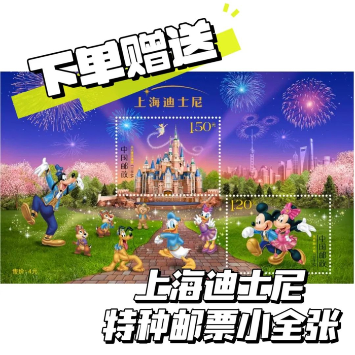 这次我们争取到了200套现货开团,跟着我下单,还会额外专属加赠一份上海迪士尼特种邮票小全张: