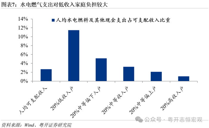 对居民来讲,公用事业涨价的整体影响有限,但或对低收入人群造成一定冲击。截至2022年底,居民人均水电燃气现金支出占人均可支配收入比重为2.7%,水电燃气支出增长10%,占人均可支配收入比重仅增加0.27个百分点,公用事业涨价对全体居民的影响有限。按照全国居民收入五等分分组,对于低收入居民和中等偏下收入居民来讲,水电燃气支出占其可支配收入比重分别达11.47%和5.11%,水电燃气支出增加10%,占人均可支配收入比重分别增加1.14和0.51个百分点。由于低收入群体生活开销基本固定,水电燃气等基本生活成本的增加,将会直接影响其生活质量。